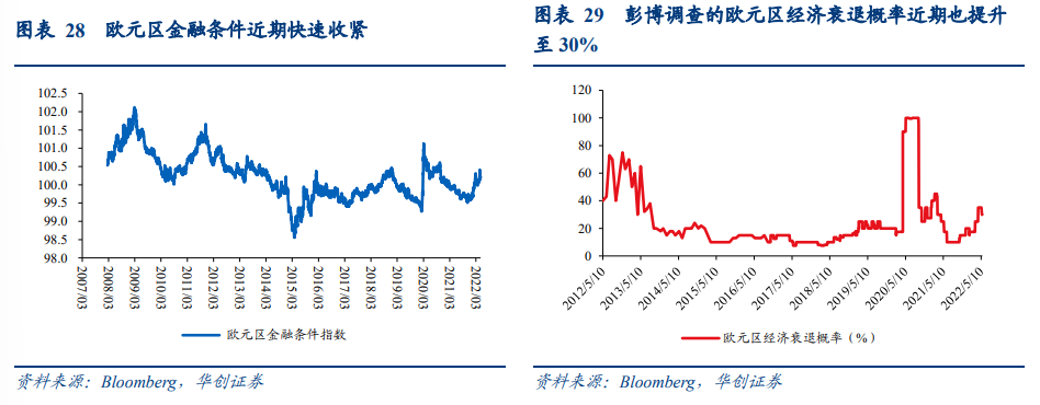 高通胀压力下,欧央行7月加息可能性大增。但货币政策紧缩并不利于呵护欧元区当前疲弱的经济修复进度。近期加息预期带来的欧元区金融条件快速收紧,彭博调查的欧元区经济衰退概率提升至30%,也反映了市场对欧元区陷入滞涨的预期升温。