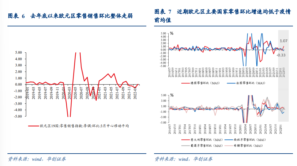 而受通胀飙升影响,欧元区居民实际购买力走弱,消费者信心持续恶化。2021年以来欧元区通胀飙升,导致虽然欧元区居民名义工资收入伴随就业修复在逐渐恢复,但实际工资收入反而下滑,2021年Q4再度大幅下滑,环比降幅达23.5%。实际收入的下滑一方面客观削弱了居民的实际购买力,另一方面也影响了居民的消费信心,截至今年4月,欧元区消费者信心指数录得-22,与08年金融危机后最差时(2009年3月)-22.3接近,而意大利的消费者信心甚至已经比金融危机时更弱。在此情况下,欧元区零售销售环比增速普遍走弱。为排除疫情导致的基数效应以及熨平数据波动,采用季调后环比3月移动平均值观测欧元区零售销售走势。从欧元区整体看,2021年11月-2022年1月,零售销售环比持续回落,2月环比回正,但仅有0.03%,接近零增,明显低于2019年月均0.2%的环比增速。分国家看,发现:(1)主流国家拉动有限,3月,德国环比转正但法国跌至负区间,录得-0.3%;(2)尾部国家仍有阻力,西班牙零售销售环比自2021年12月以来始终为负;意大利零售环比增速近期有所回落,3月录得0.1%,较上月下滑0.5个百分点,或显示零售增长乏力。![]()