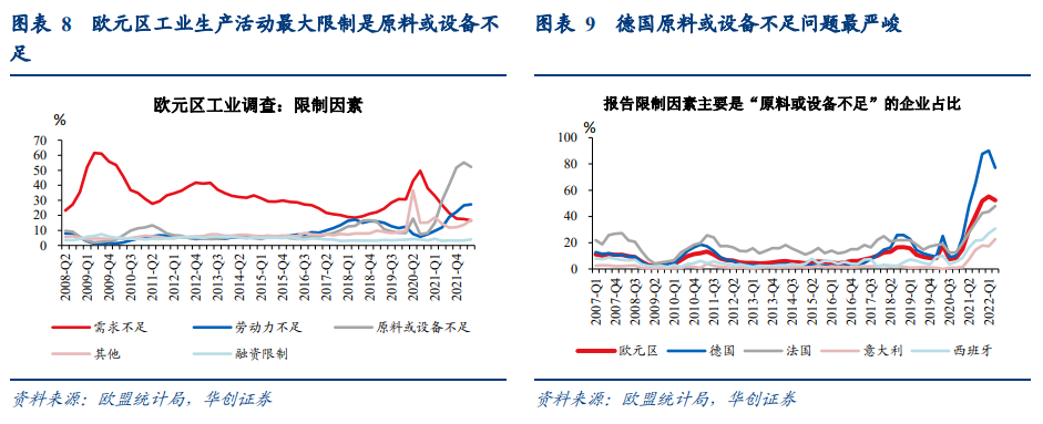 原料/设备短缺成为限制工业生产活动的主要原因。根据欧盟委员会商业调查数据,2021年下半年以来,“原料或设备不足”超过“需求不足”成为限制欧元区工业活动最主要的问题,调查中预计2022Q2“原料或设备不足”为最主要限制因素的企业占比过半,达52.3%;其次为劳动力不足,为27.3%。分国家来看,德国的原料或设备短缺问题最严峻,高达77%的企业预计2022Q2面临的原料或设备短缺问题会是最主要的生产限制因素,较欧元区平均水平高出24.8个百分点。![]()