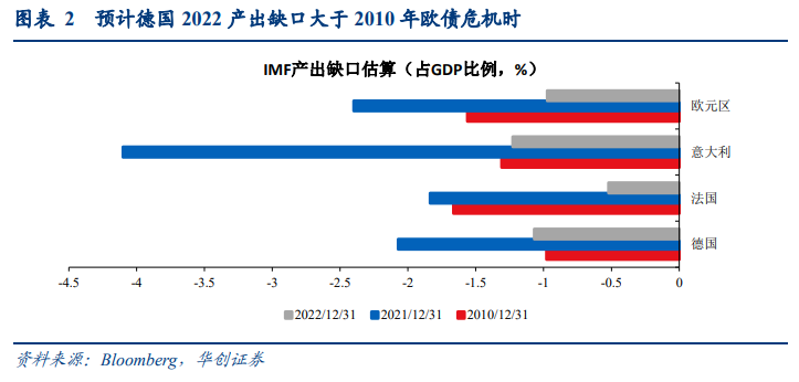 首先从整体情况来看,根据IMF产出缺口估算数据,虽然预计2022年欧元区整体情况好于2010年欧债危机时,但最大增长引擎德国情况可能更差,2022年产出缺口约为-1.1%,比2010年-1%的状况略差;尾部国家意大利的产出缺口与2010年相近,可能指向欧元区前景依然面临较大风险。