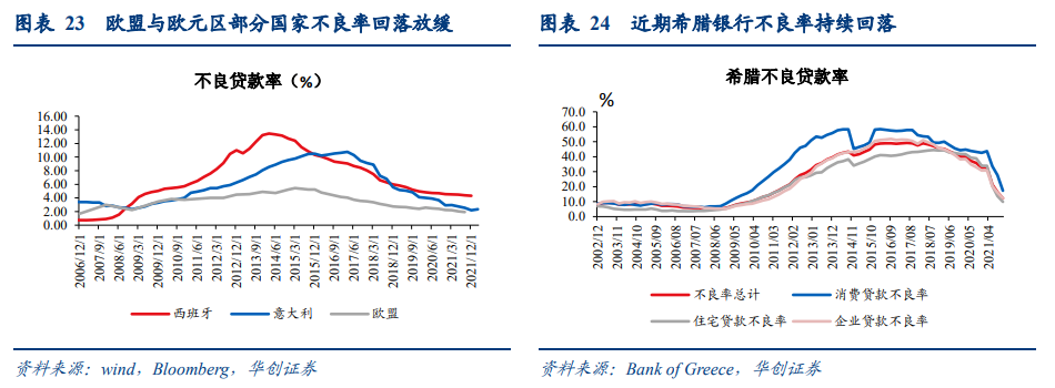 同时,欧元区银行业的不良率与资本充足率处在较健康区间,银行业抗风险能力有韧性。首先,2015年欧盟整体与欧元区部分银行的不良贷款率持续回落,目前欧盟整体不良率1.92%,已经接近金融危机前2006年底的1.7%,处在较健康区间;而欧债危机期间不良贷款率快速提升的希腊当前仍在快速回落。其次,根据EBA发布的2021年欧盟银行业压力测试结果,欧元区银行业在危机情景下的一级资本充足率将下降485bps至10.2%,巴塞尔协议三规定商业银行一级资本充足率最低标准为6%,在压力测试下欧元区银行业可维持安全的资本充足率水平。![]()