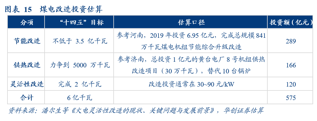 我们重点关注煤电的改造。“十四五”期间,将完成不低于3.5亿千瓦的煤电节能改造、力争达到5000万千瓦的供热改造,2亿千瓦的灵活性改造,我们估计投资额合计在575亿左右,年均投资额在100亿以上。
