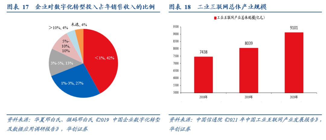 数字化转型投入估算:可以按照1%的收入作为数字化转型投入的估算。一方面,根据华夏邓白氏、微码邓白氏《2019中国企业数字化转型及数据应用调研报告》,调研样本中,数字化转型投入占年销售收入的比例中位数大概在1%左右。另一方面,根据中国信通院研究,2020年中国工业互联网总体规模为9101亿,约是当年规上企业营收的0.9%。