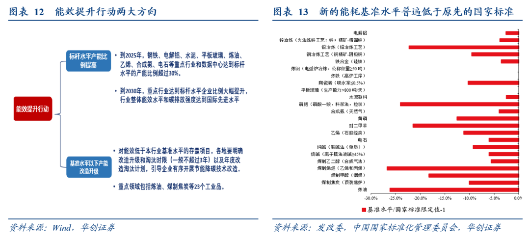 能效提升行动是双管齐下,目的是,到2030年,行业整体能效水平和碳排放强度达到国际先进水平。一是减少落后产能(能效低于基准水平)占比。推动能效低于基准水平的重点行业企业有序实施改造升级,要求三年内完成。二是提高先进产能(能效达到标杆水平)占比,到2025年,钢铁、电解铝、水泥、平板玻璃、炼油、乙烯、合成氨、电石等重点行业和数据中心达到标杆水平的产能比例超过30%。
