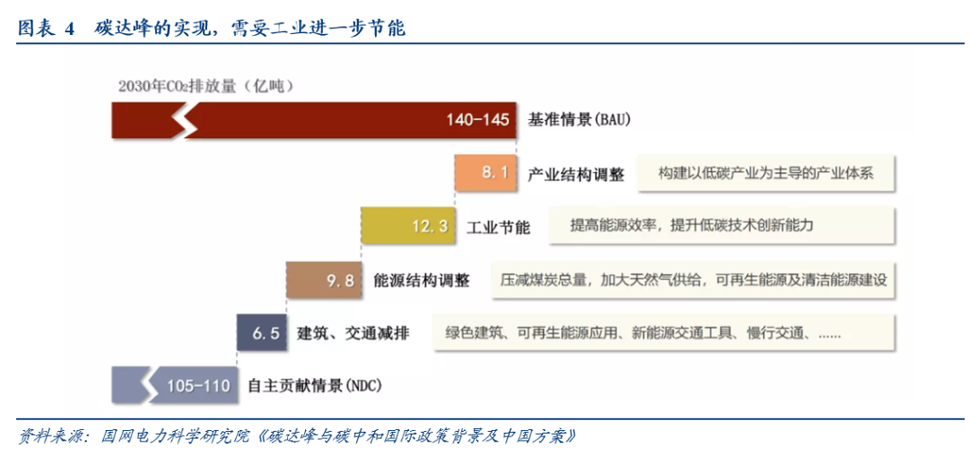 这个背景下,企业需要进行绿色化转型。根据国家电网科学研究院的研究,2030年实现碳达峰,大体需要四个领域的碳减排。其中,工业节能贡献最大。分别是1)产业结构调整,减排8.1亿吨。2)工业节能,减排12.3亿吨。3)能源结构调整,减排9.8亿吨。4)建筑、交通减排6.5亿吨。