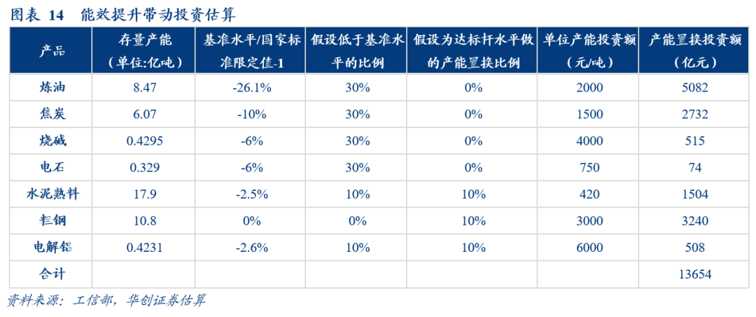 细节如下:1)收集主要工业品存量产能情况。2)估计这些产能低于基准水平的比例,其中,石化化工部分,依据发改委官网文章“当前石化化工行业低于基准水平的产能比例在30%左右。”其他部分,参考其基准水平低于国家标准中限定值的幅度作估计。3)考虑到2025年标杆水平的产能占比超过30%,对水泥、粗钢、电解铝这三个品种,假设其做一部分达标改造。4)根据单位投资额,估算产能置换需要的投资额。
