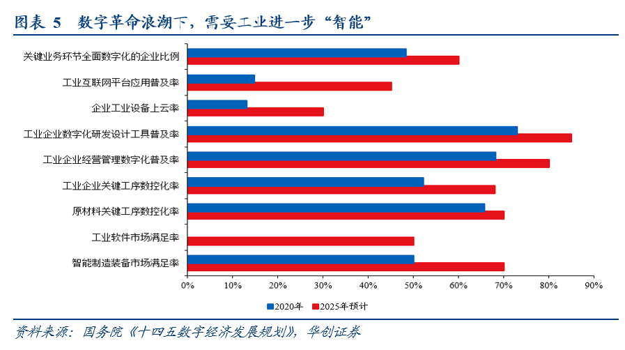数字革命浪潮下,对于工业企业而言,是系列生产环节的数字化转型。根据十四五系列专项规划,这些转型包括:到2025年,工业设备上云率提高到30%;工业互联网平台应用普及率提高到45%;工业企业经营管理数字化普及率提高到80%;工业企业数字化研发设计工具普及率提高到85%,……