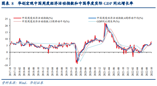 截至2022年10月2日,华创宏观中国周度经济活动指数为7.76,相对于9月25日回升了0.25。主要是因为粗钢产量以及汽车半钢胎开工率相比去年同期的回升幅度超过了乘用车销量以及石油沥青装置开工率等相比去年同期的回落幅度。华创宏观中国周度经济活动指数自8月21日触及4.69后总体处于回升趋势中,显示经济继续复苏。