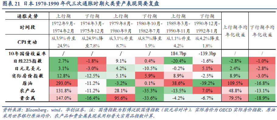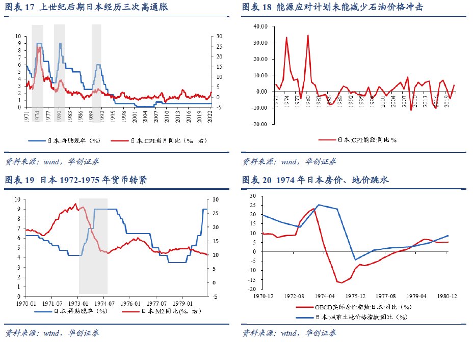 二战后,日本经历了三次高通胀时期,分别是1972-1975年,CPI同比最高达到24.9%;1979-1981年,CPI同比最高达到8.4%;1989-1991年,CPI同比最高达到4.2%。1972-1975年是日本二战后通胀最高的时期,我们下文就以此阶段作为代表,展开论述。日本1972-1975年的大通胀,主要受到流动性充裕、财政刺激、石油冲击共三方面因素的推动。1)1971年布雷顿森林体系解体后,同年12月史密森协议中约定日元对美元升值,为应对外部汇率压力,日本政府下调政策利率,同期M2中枢保持在20%以上,充裕的流动性助推物价走高。2)1972年6月,日本发布《日本列岛改造论》,本意在推动基础设施建设、消除区域发展差距,但配套的财政金融政策在日本国内掀起投机热潮,1973年日本城市土地价格同比上涨超25%,“比价效应”下,日本物价出现上行压力。3)1973年第一次石油危机爆发导致油价飙升,国际油价涨幅一度超过500%,受此带动,1974年日本CPI能源涨幅高点达44%。需求端措施主要包括:1)货币政策转紧。1973年日本央行将再贴现率从5%迅速提高至9%,并对银行贷款展开“窗口指导”;M2中枢也由1973年的25%降低至1974年的10%。2)为此前过热的总需求降温,包括限制土地投机炒作、限制建筑业房地产企业融资、对民间资本投资进行直接行政指导、推迟公共投资计划等,一系列政策措施下,需求端快速降温,日本的房价增速从1973年高点23%狂泻至1975年3月-17%。供给端的措施是,日本政府鼓励使用新能源并减少对石油的依赖。1974年,日本推行“新能源开发计划”,重点发展太阳能、地热能、合成天然气、氢能等新能源,将发展太阳能设定为国家战略,并计划到2000年政府投资超1万亿日元。1975年,日本综合能源调查会提议加强水力、地热、原子能发电,并增加非石油能源进口等。但实际上,受制于工业制造强但资源短缺的国情,日本的能源应对措施并未能有效减少石油价格冲击,在第二次石油危机爆发时,日本依然经历了严重的能源通胀。在一系列政策(主要是需求措施)以及石油冲击带来的经济减速影响下,日本CPI同比由1974年高点的24.9%下降至1975年低点7.8%。日本的通胀治理的经验教训在于,一是通过财政金融模式刺激经济,极易引发经济过热、通胀上行;二是能源安全至关重要,要强化能源多元供应和储备建设。在日本1972-1975年、1979-1981年、1989-1991年的三次大通胀中,在通胀上行期,原油、贵金属和农产品等大宗商品表现最好;其次是实际房价和日元;股市表现欠佳,年化收益为负。具体而言,三段通胀上行期,大类资产平均年化收益依次为:原油(109.5%)>贵金属(79.5%)>农产品(48.8%)>实际房价(8.9%)>日元(2.4%)>日经225指数(-2.8%)。而在通胀下行期,股市、汇市和房市表现相对较好;原油、贵金属和农产品等大宗品表现欠佳。具体而言,三段通胀下行期,大类资产平均年化收益依次为:日经225指数(-1%)>日元(-2.8%)>实际房价(-3%)>农产品(-13.1%)>原油(-16.8%)>贵金属(-18.9%)。因彭博日本国债指数和日本长端国债收益率数据较短,债市表现缺失。但仅就1989-1991年的数据来看,在通胀上行期间,日本10年期国债收益率从5.11%升至6.96%,上行了184.7个bp;在通胀下行期,10年期国债收益率从6.96%降至5.57%,下行了139.3个bp。![]()