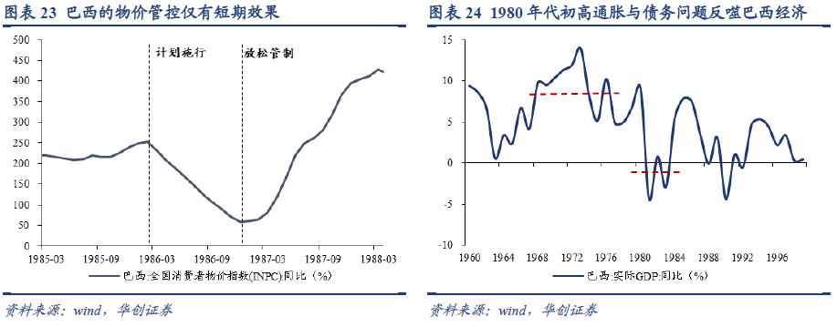 上世纪六七十年代,巴西经济高速成长,但进入八十年代后通胀快速升温,1986-1996年间到达顶峰,通胀高点近3000%。在应对措施上,在1986-1993年间,巴西政府先后推出多个抗通胀计划,其中,1986年《克鲁扎多计划》以“非正统”方式抗通胀、1993年《雷亚尔计划》取得长足成效,下文将着重阐述。 该计划的提出既有理论支撑,也是形势所迫。理论方面,内生性通胀论开始普及,该理论认为各个市场主体致力于维持其在经济分配中的份额,而一旦出现通胀苗头,各主体将竞相提价以维护自身利益,通胀也将在“左脚踩右脚”中形成正反馈,典型的如南美曾广泛施行的指数化制度(即工资等价格的制定都以之前的涨幅为基础外推)。内生通胀理论的药方是政府强制干预:当通胀失控时,政府应当果断冻结物价,并对工资、汇率及其他经济项目进行管控。因为该措施与“正统”的西方经济学理念相去甚远,故被称为“非正统措施”。形势方面,1980年代巴西通胀开始飙升,INPC(全国消费者物价指数)由两位数迈向三位数,高企的通胀与债务问题反噬经济,GDP平均增速从1970年代的9%左右降至1980年代的3%左右。实践方面,八十年代初巴西政府一度施行的“正统”需求端管控措施并未奏效,巴西政府不得不寻求新的解决方案。在此背景下,巴西于1986年2月宣布实行“非正统”的克鲁扎多计划,措施主要包括:1)货币改革,由新货币“克鲁扎多”取代旧货币“克鲁塞罗”,兑换比率为1:1000。2)冻结物价,政府自计划公布日起,对约500种主要消费品价格实施管控,由价格检查员监督,同时公众享有非正式监督权;违反价格控制的商家将会受到严厉惩罚。3)工资管控,将工资设定为过去六个月的均值,并且将最低工资由600克鲁扎多调至804克鲁扎多;此外建立工资自升机制,即当CPI累计上涨20%后工资可自动增加。4)汇率方面,计划未对汇率做出硬性要求,但巴西政府暗示锚定1美元=113.84克鲁扎多。5)除一年期以上的商业合同外,其他合同禁止指数化。计划仅在短期压制通胀,管制放开后通胀压力反扑。计划施行9个月后,INPC同比稳步下行、由250%降至70%。然而好景不长,1986年11月,巴西政府换届后逐步放开价格管制,通胀压力开始反扑,1987年底通胀冲高至400%。克鲁扎多计划破产后,巴西政府又陆续出台了多项反通胀计划,但都仅有短期效果,随后通胀压力大幅反弹。在前几次经验的基础上,1993年推出的雷亚尔计划取得长足成效,具体分四步展开:准备阶段:主要是政策吹风,计划正式实施前半年,巴西政府便公布计划内容及实施时间表,并与社会主体充分沟通,整体措施更加透明。第一步:主要是财政体制改革与舆论引导。1)推进财政体制改革和平衡预算改革,包括建立“紧急社会基金”缓解联邦政府的开支压力、提高税率扩充财源,推进国企私有化,减少预算软约束的同时,扩充政府财力。2)舆论引导,向公众宣传控制通货膨胀的必要性等。第二步:重置国家价格“锚”,即设立“实际价格单位”,央行每天根据布鲁塞尔与美元的汇率变动,调整布鲁塞尔与“实际价格单位”的比价,换言之,“实际价格单位”锚定美元而与布鲁塞尔无关。“实际价值单位”的记账功能首先应用于工资,1个“实际价值单位”=前四个月的平均工资所代表的价值量,随后推广到商品价格、经济合同等。彼时巴西经济实质上推行非美元的美元化。第三步:货币转换与财政规范。具体:1)将“实际价值单位”转变为正式货币“雷亚尔”,并采用1雷亚尔=2750克鲁赛罗雷亚尔进行货币转换。2)为了维护货币币值,雷亚尔仍旧与美元1:1挂钩,政府要求央行以外汇储备为基础,按照1:1比例与雷亚尔实际流通额挂钩,并对基础货币进行数量限制。3)以出售国企股份筹集的资金建立公共债务偿还基金,切断财政赤字向货币超发的传导链条,1994年基金总额约1000亿雷亚尔,为国内债务总额的两倍。雷亚尔计划取得了显著效果,巴西CPI从1994 年6 月的48.2%降低至12 月的2.2%左右。此后也维持在两位数以内。南美国家在经济发展道路、经济指导思想上有一定共通性。二战后,阿根廷的通胀动态可分为三阶段:1945-1974年通胀中枢在15%,1975-1992年通胀中枢在300%,1993-2002通胀中枢在0%附近,2003年至今通胀压力逐步上行。其中1976-1992年通胀压力急剧升温、峰值超20000%。在控通胀措施上,我们选取1975年的阿斯特洛尔计划和1991年的兑换计划详述。与巴西相似,前期诸多反通胀措施失败后,阿根廷政府开始尝试非传统手段,1985年6月阿根廷施行阿斯特洛尔计划,具体措施包括:1)价格管制。参照上月通胀,将物价上调之后予以冻结,同时工资、汇率一同冻结。2)财政紧缩。大力削减财政赤字,计划将财政赤字/GDP从1985年上半年的12%下降至2.5%,财力缺口将由公共部门提价和增税弥补。3)货币方面,一是实行货币改革,使用新货币“阿斯特洛尔”替代旧货币“比索”,兑换比率初期为1:1000,此后每日动态调整;二是推行固定汇率,新货币与美元挂钩;三是为了防止通胀下降后,资本回报高于实体回报,将银行利率从28%降至4%。该计划只有短期效果,长期看通胀压力仍存。短期看效果立竿见影,阿根廷CPI同比从1985年6月的1100%下降至年底的约400%,1986年初一度回落至两位数。然而价格管控并非长久之计,管制下的比价失衡和供应短缺促使阿根廷政府在1986年4月逐步放开价格管制和货币约束,随之通胀压力卷土重来,于1990年达到历史峰