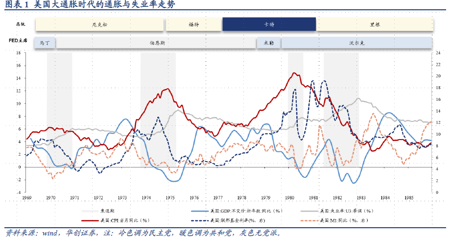 在沃尔克时期以前,美国治理高通胀的失败,有以下几个方面的经验教训:Ø价格的行政管制不可取。尼克松施行的价格冻结和管制措施最开始有一定成效,“被视为政府最终对通胀采取强有力措施的标志”[2],1971-72年美国通胀略有下降,美国《1973年经济报告》甚至称“美国的反通胀政策已成为令其他国家惊羡的奇迹”。但这更多是行政限制下的扭曲,而非供需关系及公众预期的反映。价格管制导致供求失衡,“黑市价格”流行于市,真实的通胀压力不减反增,在取消价格管制后,通胀再次上升。Ø自发式的公众运动不应成为反通胀政策的核心。福特政府的“WIN”行动以满地鸡毛收场,除了徒增政策笑柄外,对通胀治理毫无益处。Ø政治压力下,央行独立性受限不利于通胀治理。尼克松政府时期,伯恩斯与政府联系十分密切,伯恩斯曾言“我仍然是他(尼克松)最好的朋友。通过坚定立场,我将更好地为经济和总统服务”[3]。期间,货币政策时常要配合政府执政纲要或政治目的,重就业,轻通胀。Ø在政治压力之外,对通胀成因和货币政策适当作用的认知变化,是美联储在1970年代难有作为的另一大原因。伯恩斯认为,“通胀与货币政策无关,其主要受成本推动,比如大企业和工业的力量、油价冲击,而不是需求因素拉动。相比于紧缩财政和货币政策,政府实行价格和工资管制以遏制通胀的成本更低。此外,价格管制还将释放货币和财政政策空间以便于支持增长和就业”[4]。伯恩斯时期,美联储货币政策的导向更侧重于就业,一旦经济陷入衰退便宽松刺激,对抗通胀的政策并不连续,结果是通胀和通胀预期继续大幅上行,并且政策可信度大幅降低。沃尔克成功驯服通胀,也有一些启示:一是,经济的可持续增长和充分就业需要以物价稳定为前提,滞涨时期,要先解决胀,再解决滞。二是,相比于财政政策或收入政策,货币政策仍是对抗通胀最直接、最有效的手段。三是,当断不断,反受其乱。高通胀时期,为防止通胀的自我固化,货币政策应当保持独立性和连贯性,直至通胀目标达成。在美国1970-1980大通胀年代,在通胀上行期,贵金属、农产品和原油等大宗商品表现最好,年化收益均在50%以上;其次是国债指数和实际房价,有小额正收益;股汇表现最差,年化收益为负。具体而言,三段通胀上行期,大类资产平均年化收益依次为:贵金属(59.9%)>农产品(58.6%)>原油(55.8%)>国债指数(3.4%)>实际房价(2%)>美元指数(-1.3%)>标普500指数(-3.1%)。而在通胀下行期,股债表现最好,年化收益均在10%以上;其次是原油、美元指数和实际房价,有小额正收益;农产品和贵金属表现最差,年化收益为负。具体而言,三段通胀下行期,大类资产平均年化收益依次为:标普500指数(15.5%)>国债指数(12.4%)>原油(5.3%)>美元指数(3%)>实际房价(0.4%)>贵金属(-4.2%)>农产品(-14%)。![]()