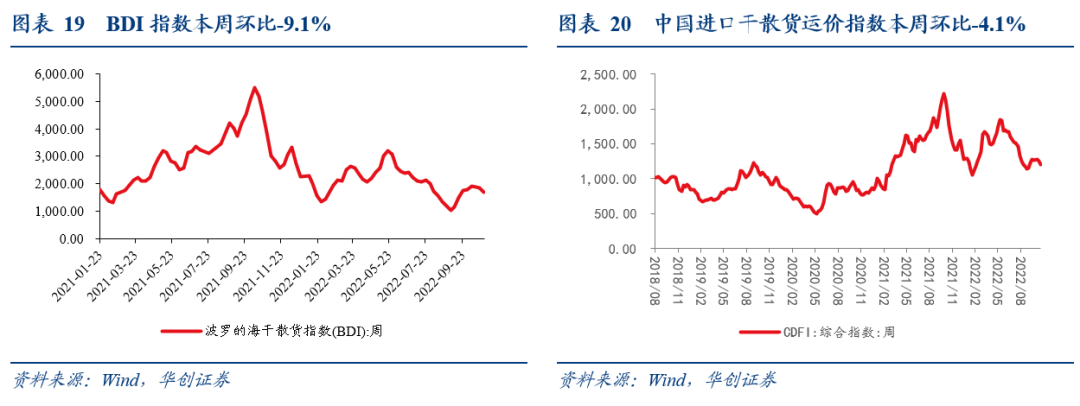 BDI指数本周环比-9.1%;CRB现货指数与工业原料指数本周环比+0.2%/-0.2%;中国进口干散货运价指数本周环比-4.1%;中国出口集装箱运价指数本周环比-5%,其中美东航线与欧洲航线运价指数环比-5%/-6.8%。