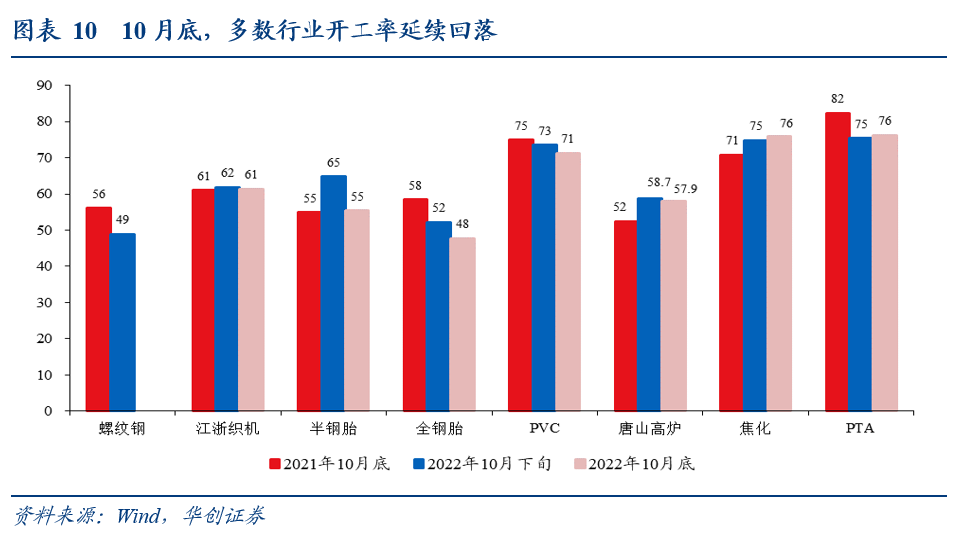 开工率:10月底,多数行业开工率延续回落。我们统计的9个行业中,除螺纹开工率未更新外,其余8个行业中,江浙织机、半钢胎、全钢胎、PVC、唐山高炉、石油沥青6个行业开工率下滑,其中汽车相关的半钢胎、全钢胎分别下滑9.4pcts、4.5pcts。仅PTA、焦化开工率有所上行。