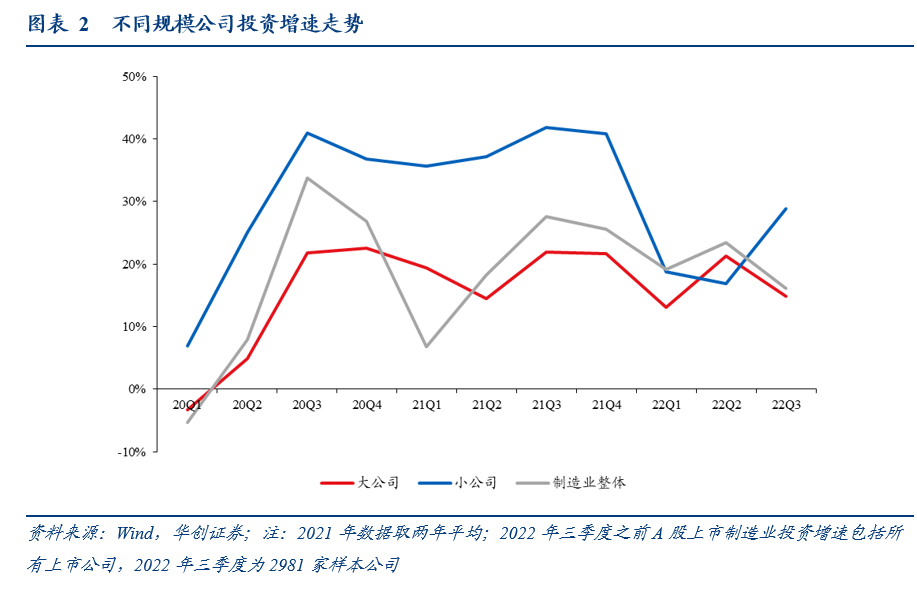 整体来看,小公司的投资增速要高于大公司。三季度小公司的投资增速为28.9%,较大公司的14.8%高出14pcts。2020-2021年,小公司投资增速较大公司平均高出18pcts。今年前两个季度,二者差距有所减小,一季度小公司投资增速较大公司高出6pcts,二季度较大公司低4pcts,但三季度二者差距重新拉大。