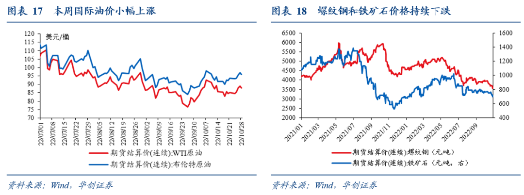 货运物流:连续三周降幅扩大。10月23日-29日,货运物流指数平均为93.5,同比-30%,10月15日-22日同比为-27%,10月9日-14日同比为-24%。