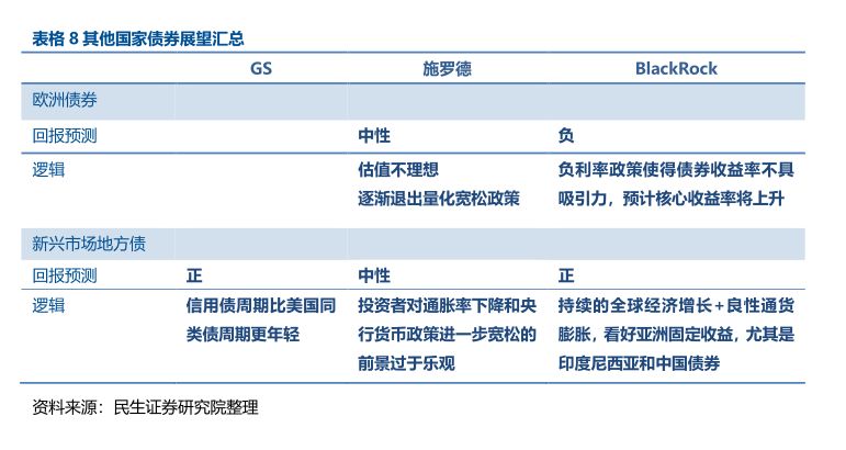 3、 固收:上述几家外资行一致不看好美国国债、欧洲债券;一致看好TIPS作为通胀防御;对美国市政债、高收益企业债、新兴市场地方债看法分化;