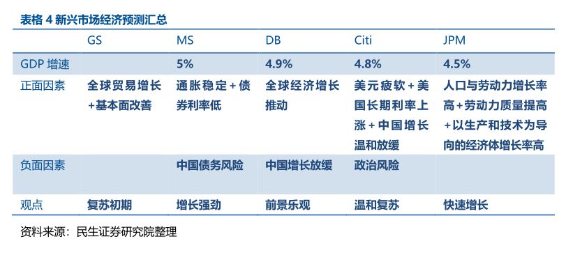 明年普遍预期的GDP增速为4.9%-5%。各家对新兴市场的看法较为一致,都是在全球经济同步增长、大内外经济环境改善情况下的增长态势,但风险仍存,比如中国增速放缓风险和债务风险、美国贸易政策风险。
