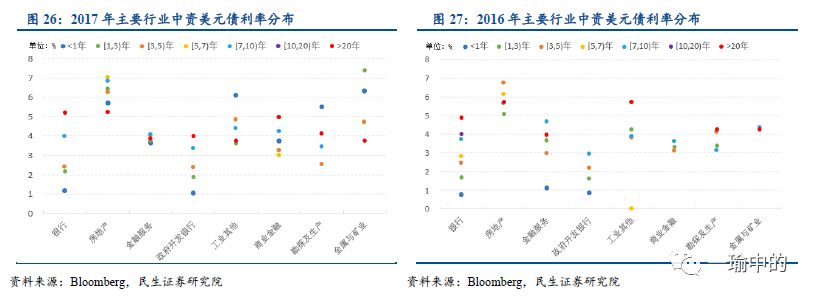 从行业分布来看,2017年各行业发行中资美元债的利率中枢略有上浮,但行业内部的发行利率进一步分化。这一方面归因于整体发行数量增加,丰富了个别行业美元债的期限类别;另一方面,个别资质相对较差的企业2017也开始进入美元债市场融资,发债成本较行业平均水平明显偏高。
