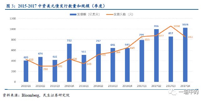 从季度数据观察一级市场趋势,中资美元债2017年增长趋势稳定,发债额和发债数量稳步抬升。三季度发行数量达到历史最高,共发行1058只,四季度发债额达到历史最高,共融资1024亿美元。
