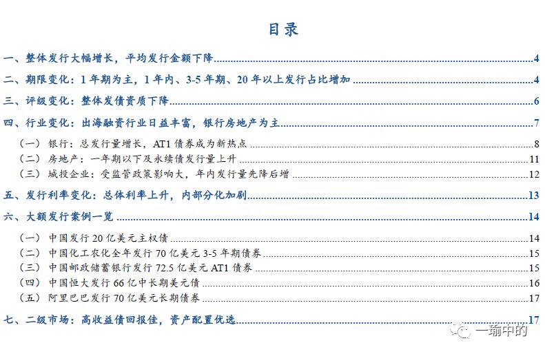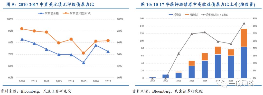 整体发行大幅增长,平均发行金额下降 2017年中资美元债发行总量和金额持续增长,全年发行中资美元债3643只,规模总计为3671亿美元,17年边际增速上升明显。以发债只数计,2017较16年增加75.8%,而16年较15年增幅只有42%,增速提升一倍。以发债金额计,2017年一级市场总量较16年增长了46%,超过了16年24.7%的增速。 从季度数据观察,中资美元债2017年发行量稳步抬升。三季度发行数量达到历史最高,共发行1058只,四季度发行金额达到历史最高,共融资1024亿美元。 期限变化:1年期内为主,1年期以下,3-5年期,20年期以上品种发行量增加 2017年中资美元债的发行期限仍然以1年期内为主,从占当年发债比例来看,1年期以下,3-5年期,20年期以上(主要为永续债)三类债券的发债比例增加。 1年期内的比例继续上升原因是其具有不需要于发改委备案的优势。下半年发改委对企业海外发债政策收紧,促使一部分企业选择改发1年期内债券。 3-5年期美元债2017年发行量较2016年大幅增长,主要来自于一批国有企业和国有银行新发行20只规模10亿美元及以上的3-5年期债券。 超过20年期的债券在2017年发行量大幅增长,其中大部分为永续债。具体发行主体中,以房地产企业和银行为主,其中银行发行的永续债主要是AT1债券。 评级变化:整体发债资质下降 2017年发行的中资美元债中,债券评级缺失的现象依然大量存在,整体发债资质略有下降。从占比上看,无评级债券占总发行债券的比例依然保持在高位,按发行金额占78%,按发行数量占96%。且获评级债券中,投机级别债券的比例上升,2017年按发行数量上升至36.84%,按发行金额上升至29.97%。 按行业来看,已获得评级的债券中,房地产行业的评级资质较差,金融服务业和零售-非必需消费品次之。 此外,受中国主权评级下调的影响,2017年中资美元债评级调整情况较多。 行业变化:出海融资行业日益丰富,银行房地产为主 从行业来看(按BICS 2级),2017年发行中资美元债的企业所属行业更为丰富,共计37个行业,相比16年新增的行业主要为消费零售类和能源类。 银行业依然占比最高,按发行数量计,占比86.9%,按发行金额计,占53%。其次是房地产行业,按发行数量占比为2.9%,但按发行金额占比较高,达到全部发行量的13%。 银行:总发行量增长,AT1债券成为新热点 2017年银行美元债发行量在2016年高位上继续增长。发行主体中,国有银行依然是发行银行美元债的主要力量。除境外融资成本优势和再融资压力外,银行发行美元债有两个增量动力:一是政策层面鼓励通过海外发债引入外汇,二是境内监管趋严,银行补充资本金动机增强。 AT1债券作为银行补充资本金的工具之一,2017年以来出现显著放量,发行主体以股份制银行和城商行为主,年内共发行了7只AT1美元债,共计150.65亿美元。2017年中小银行在海外发行AT1美元债数量增长,与内地监管环境趋严,中小银行补充一级资本的工具有限有关。 房地产:一年期以下及永续债发行量上升 2017年房地产美元债发行经历先增后降的过程,受国家政策调控明显,进入2017年四季度,房地产美元债发行数目骤减,发行金额也进一步回落。 从发行期限上来看,2017年房地产美元债出现较大变化,1年期以下、10年期及以上债券发行数量明显增加,其中10年期及以上债券实际上基本为永续可赎回债券。 1年期内发债数量在17年二季度后增加,主要是由于发改委收紧发放房企海外发债批文,1年期以下的美元债成为房地产企业海外发债遇阻时融资的替代工具。 永续债今年得到房地产的青睐,与永续债股性较强的特性有关,有利于企业改善资产结构。此外,美国国债收益率曲线平缓,为发行永续债提供了绝佳的利率条件。 城投企业:受监管政策影响大,年内发行量先降后增 城投美元债上半年发行量一度骤减,二季度仅发行一只,但进入下半年后发债规模有所恢复,四季度共发行14只城投美元债,发行金额共计35.35亿美元。 我们认为2018年城投美元债发行量上半年或继续放量,全年发行总量保持平稳。2018年随着债务置换进入攻坚期,城投平台大量债务到期,地方政府海外发债的意愿会进一步加强,但限于国家控制地方政府债务的政策目标不变,整体规模或变化不大。 发行利率变化:总体利率上升,内部分化加剧 2017年新发行债券中,中资美元债的总体平均发行利率为1.58%,较2016年上升了0.38个百分点。 从期限分布上看,2017年中资美元债利率曲线较为平缓。从评级分布来看,获评级债券的发行利率近两年来有所下降。从行业分布来看,2017年各行业发行中资美元债的利率中枢略有上浮,但行业内部的发行利率进一步分化。 大额发行案例一览 2017年中资美元债一级市场除了有20亿美元无评级主权债发行之外,还有一系列具有代表性的企业(中国化工、邮政储蓄银行、中国恒大、阿里巴巴)发行了大额美元债,基本都实现超额认购,对一二级市场都形成了影响较大的影响。 二级市场:高收益债回报佳,资产配置优选 中资美元债iboxx指数2017年全年总回报率为4.95%,下半年来,高收益中资美元债相对投资级中资美元债信用息差有所缩小,年内曾于7月和11月出现两次较大的回调,总体回报全年跑输新兴市场。 但从资产配置角度考虑,中资美元债尤其是高收益级别债券,风险调整回报依然位列各类股/债资产之首。 风险提示: 汇率超预期波动,境外发债政策变化。 |