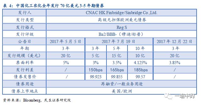 中国化工农化于2017年内通过两家海外子公司CNAC HK Finbridge和CNAC HK Synbridge共计发行了70亿美元3-5年期债券。法巴、中银国际、中信银行(国际)、瑞信、汇丰、摩根士丹利担任发行的联席全球协调人和联席簿记人。