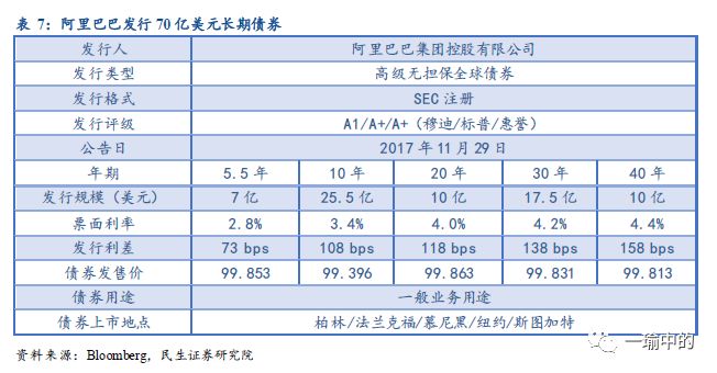 阿里巴巴集团于2017年11月29日开始分五档发行了70亿美元的债券。本次发行的5.5年、10年、20年、30年和40年部分票面利率分别为2.8%、3.4%、4.0%,4.2%,4.4%。本次发行由摩根士丹利、花旗、瑞士信贷、高盛、摩根大通担任美元债券的承销商和联席簿记人。