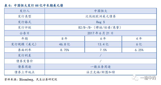 2017年6月21日,恒大发布公告宣布发行66亿美元的债券,其中包括28亿美元根据要约交换发行的债券,以及38亿美元的额外新债券。瑞士信贷、中信银行(国际)及海通国际为此次发行的联席全球协调人和联席簿记人。恒大新发售的3只债券中包括一只46.8亿美元的债券,票面利率为8.75%,时间长达8年。该只新债发行得到超过2.26倍的认购,恒大完成规模巨大的美元债发行,显示出国际投资者对恒大实力与信誉的高度认可。
