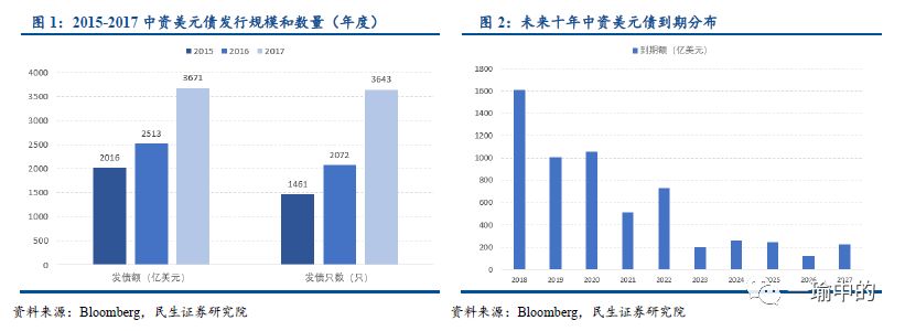2017 年中资美元债发行总量和金额持续增长,边际增速上升明显。全年中资发行美元债3643只,规模总计为3671亿美元。以发债只数计,对比2015-2016年,2017发债只数大幅增长,较16年增加75.8%,而16年较15年增幅只有42%,增速提升一倍。以发债金额计,2017年一级市场总量较16年增长了46%,超过了16年24.7%的增速。平均单笔融资金额有所下降。此外,目前从发行期限统计来看,2018 年中资美元债将迎来到期高峰。