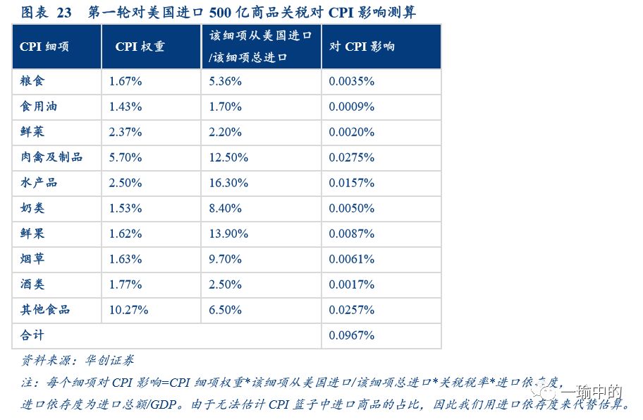 1.拆分匹配法:1100亿美元进口商品关税对CPI拉动0.13%-0.29%