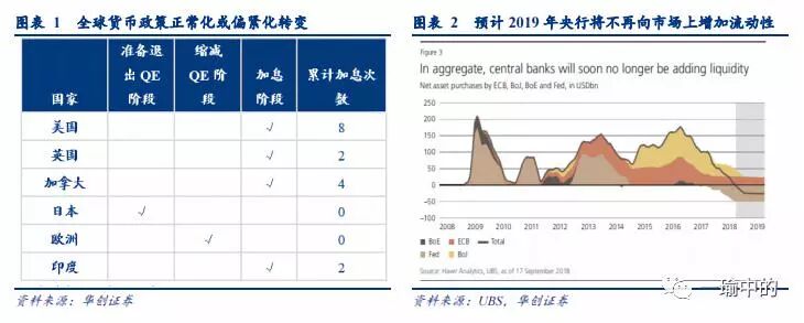 全球货币政策朝着正常化或偏紧的方向转变,全球央行总量即将进入流动性净收缩局面:在本轮货币政策转向过程中,美国、英国、加拿大和印度已分别加息,欧洲和日本也处于退出和准备退出QE阶段。预计在2018年底全球主要发达国家央行(美联储、欧央行、英央行和日央行)所持有的资产规模或出现总量的下降,将不再向市场提供增量流动性。