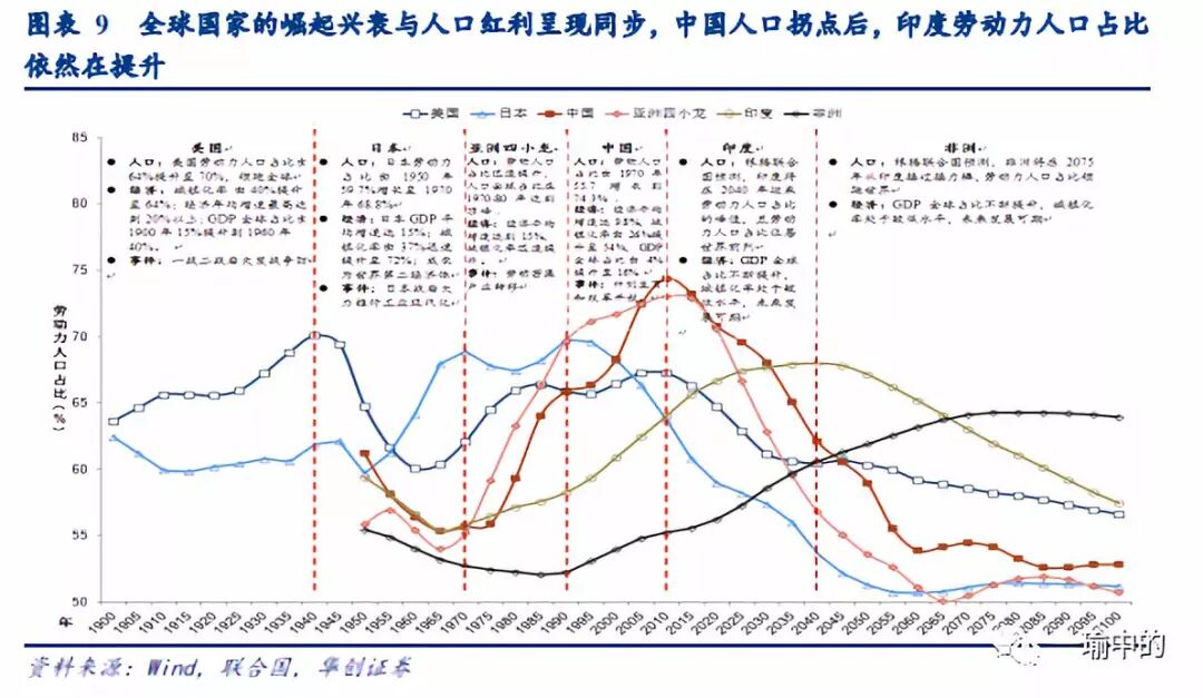 全球出现了人口红利接力棒的断档:全球人口的接力棒从二战开始到2050年分别是:美国—日本—四小龙—中国—印度—非洲,中国在2014年已经出现刘易斯拐点,人口红利的接力棒要交接到下一个国家手上。印度看上去最像中国的红利接班人,然而短期内依然很困难。印度的问题在于印度人口有数量无质量(死亡率、文盲率较高,抚养比、农村人口偏高)且产业结构哑铃型(三产结构中二产极其薄弱,营商环境较差)。