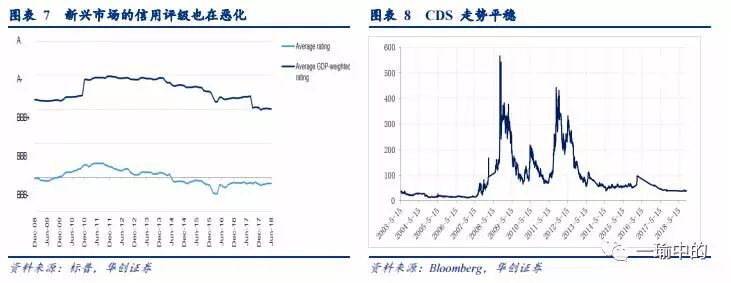 从这轮加杠杆的主体来看,企业、政府、新兴市场信用资质在变差,但风险定价并没有随之匹配:根据标普环球的数据显示,标普环球企业信用评级中值已降至BBB-;评级主权国家的信用从08年底的BBB到18年6月已经降至BBB-水平,评级质量不断下降;新兴市场加权平均评级变动也从A-至BBB+的中间水平下降到了BBB+。但目前市场对其的风险定价并未与之匹配(全球HY spread并未明显走高,CDS走势平稳),信用定价不够充分,风险和收益已经不对等。