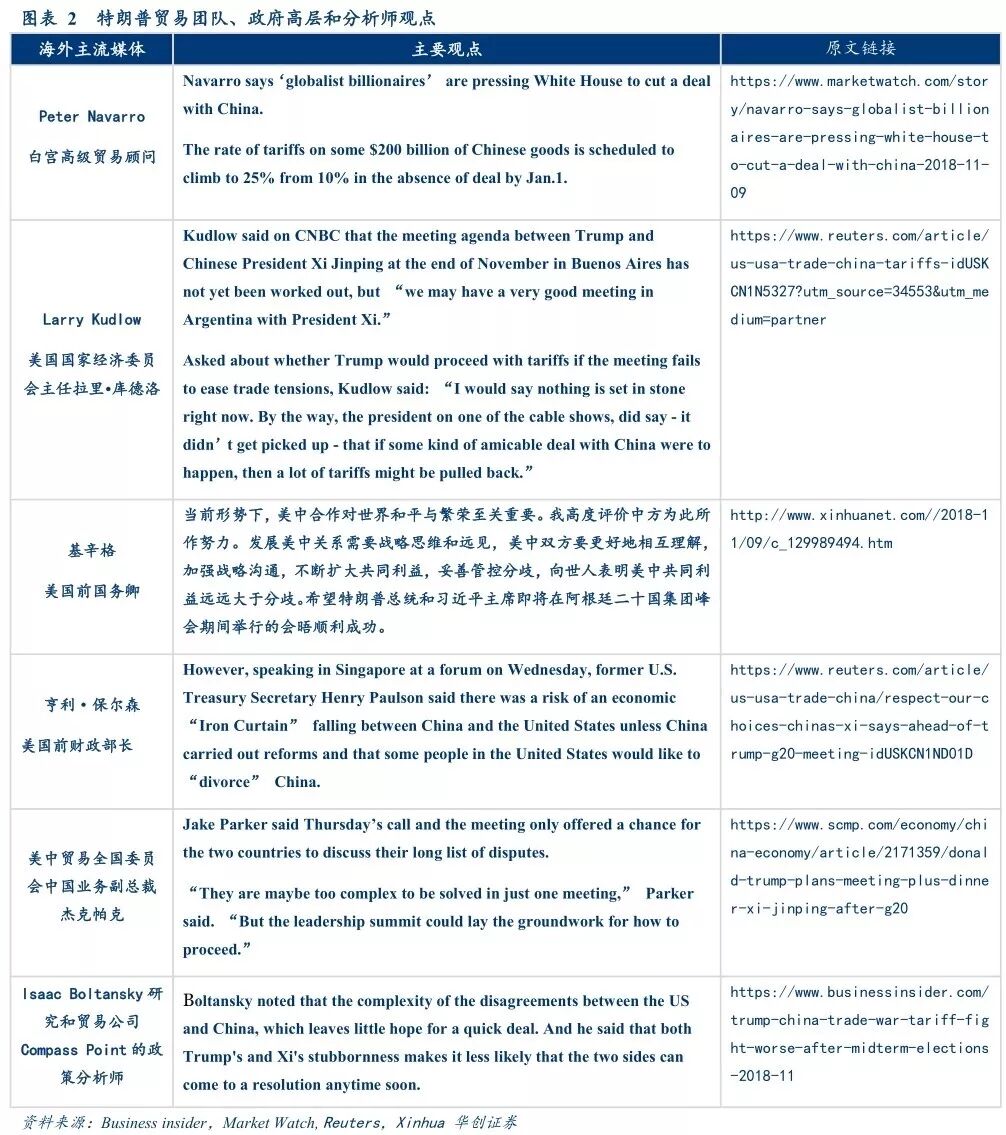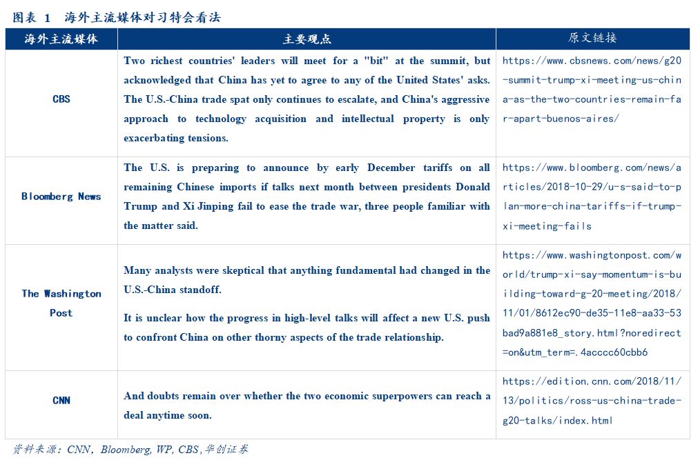 特朗普总统和习近平主席计划于11月月底在阿根廷布宜诺斯艾利斯举行的20国集团峰会上会面。在经过数月剑拔弩张的贸易摩擦后,中美两国领导人于11月1日互通电话为贸易战降温。现在白宫不再高调谈及对所有中国进口美国商品加征关税,而且开始谈及取消部分关税的可能性,虽然没有给出确定的答复,但也凸显了白宫姿态的变化。在习特见面后,美国与中国能否达成最终协议或者中美贸易摩擦能否得到改善,可能会逐渐明朗。为此我们重点梳理了近期海外主流媒体、美国重要人士(美国高官、特朗普贸易团队和一些分析师)以及海外投行对习特见面的看法,详情如下: