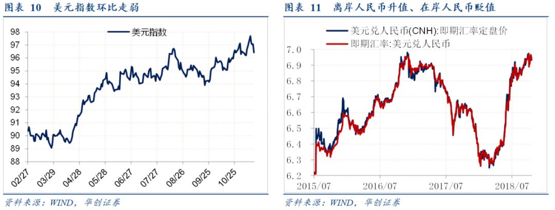 上周,美元兑人民币即期汇率收于6.9474,环比上行34bp;美元兑离岸人民币即期汇率收于6.9330,环比下行114bp(图表11)。上周外管局公布了10月银行结售汇数据,10月银行结售汇逆差29亿美元,逆差较9月大幅收窄;其中,银行自身结售汇顺差5.5亿美元,代客结售汇逆差35亿美元。