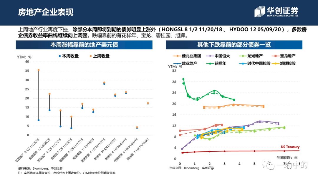 具体行业上,各行业投资级债券表现均比较稳定,部分温和上涨,但高收益级表现依然不佳,尤其是地产和能源系。地产企业债券上周继续下跌,除部分本周即将到期债券价格上涨,花样年(FTHDGR)、宝龙(PWRLNG)、碧桂园(COGARD)、旭辉(CIFIHG)等债券接近全线下跌。能源系债券表现持续低迷,中国物流(CNLOGI)、海隆控股(HILOGO)、来宝集团(NOBLSP)下跌幅度较大。