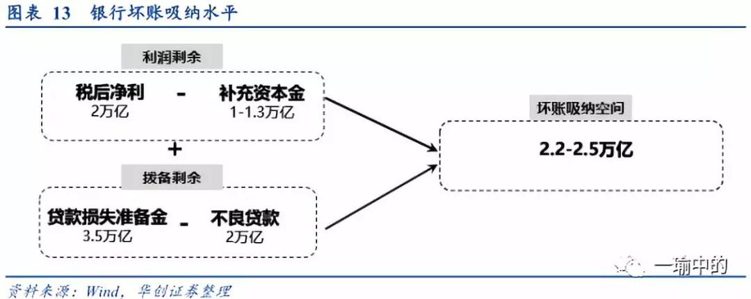 截至二季度末,商业银行贷款105万亿,不良贷款2.0万亿,贷款损失准备金3.5万亿左右,每年税后净利2万亿。假设银行税后利润的1/2-2/3用于补充资本金,那么在不影响银行资本金考核、银行稳健经营、不考虑政府注资扶持的条件下,预计金融机构极限吸纳坏账幅度在2.2-2.5万亿(对应不良率的上限是4%-4.3%)。银企共同体考验的是银行的坏账吸纳水平,银行体系是面对经济下行与坏账的第一吸纳屏障,这道屏障目前的吸纳力还有2.2-2.5万亿的空间。
