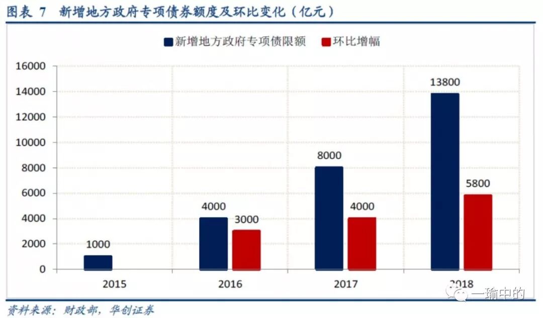 由于地方政府专项债纳入政府性基金预算管理,因此其发行规模不占赤字额度,不影响赤字率水平。一方面,说明地方政府专项债券的增加不受赤字率的约束;但另一方面,也无法通过赤字率水平做相应的估算,因此对于专项债规模净融资额更多为一种“猜想”。2018年中央经济工作会议对专项债表述为“较大幅度增加地方政府专项债券规模”,我认为“较大幅度”至少不能明显低于2018年的环比增量“5800亿元”,也就意味着明年地方政府专项债规模至少应该在2万亿左右甚至可能明显高于2万亿。