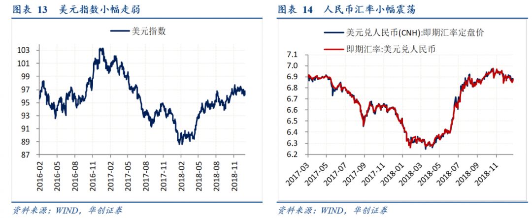 上周,美元兑人民币即期汇率收于6.8645,环比下行13bp;美元兑离岸人民币即期汇率收于6.8741,环比上行50bp(图表14)。上周央行召开2019年工作会议指出“稳步深化汇率市场化改革”,相较于2018年“加大市场决定汇率的力度”的表述略有调整。上周2019年全国外汇管理工作会议召开,相较于2018年工作会议内容而言主要有两点变化:一是更加强调对外开放,强调“进一步完善合格境外机构投资者制度,研究准入前国民待遇加负面清单管理制度下的外商投资企业外汇管理框架”,而2018年仅仅提出“保护外商投资合法权益”;二是重点强调了深化外汇管理“放管服”服务,“进一步支持自贸试验区、粤港澳大湾区和海南全面深化改革”。