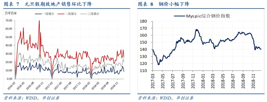 元旦假期致上周地产销售环比大幅下降。上周30大中城市商品房日均成交面积54.26万平方米,整体同比上升28.63%,其中,一线和三线城市同比分别上升44.30%和90.27%,二线城市同比下降0.18%;受元旦假期影响,整体环比下降24.90%,其中,一、二、三线城市环比分别下降34.43%、26.21%和17.80%(图表7)。土地成交方面,截至1月6日,过去四周100大中城市土地成交面积6419.82万平方米,较去年同期的8755.16万平方米下降26.67%。