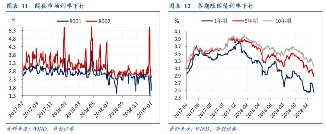 上周央行先后两次宣布降准,1月2日宣布将普惠金融定向降准小型和微型企业贷款考核标准由“单户授信小于500万元”调整为“单户授信小于1000万元”;1月4日央行宣布全面降准,2019年1月15日和1月25日分别下调0.5个百分点。根据央行口径预计,此次降准+TMLF+一季度到期MLF净释放长期资金近8000亿。上周央行召开2019年工作会议,部分变化如下:(1)延续先前“稳健的货币政策保持松紧适度”的提法,但较去年工作会议强调要平衡好总量和“结构”指标;(2)服务实体经济的任务提前到第二位,要求“进一步落实金融服务实体经济各项措施”,并继续强调“从债券、信贷、股权等方面引导金融机构加大对民营企业支持力度”;(3)对2018年的工作总结中认为“防范化解重大金融风险赢得良好开局”,相对应的“防范化解重点领域金融风险”由第二位下滑至第三位。总体来看,2019年货币政策仍然以稳健为方向,但重点将加强政策预调微调和定向支持小微、民企。