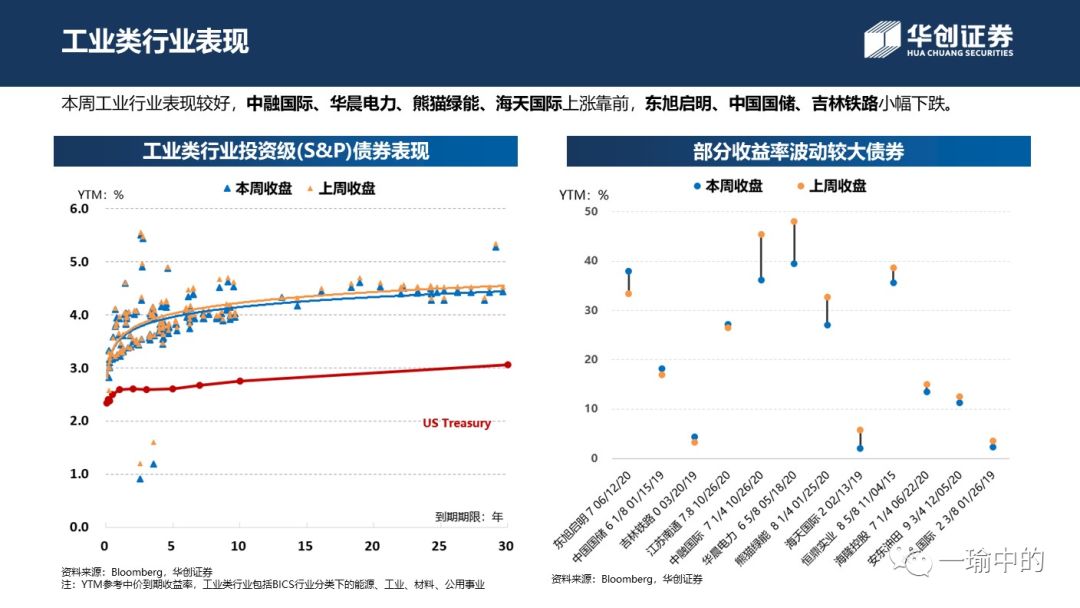 金融服务业本周投资级小幅下跌,高收益债券中,多家民营金融平台尚乘集团(AMTDGC)、中民投(CHMINV)、中瑞实业(ZRINDU)等下跌靠前。工业类企业中中融国际(SDCOKI)、华晨电力(HCELEC)、熊猫绿能(GDPOLY)、海天国际(HTINL)上涨靠前。