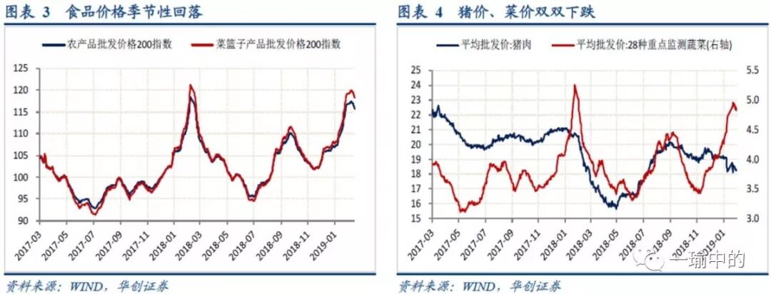上周,农产品批发价格200指数收于115.79,环比下降1.39%;菜篮子产品批发价格200指数收于118.18,环比下降1.54%(图表3)。细项数据看,上周猪肉价格环比下降1.40%,蔬菜价格环比下降2.43%(图表4)。猪价方面,上周云南怒江泸水市、山东济南莱芜区、广西北海银海区发生非洲猪瘟疫情。近期非洲猪瘟疫情演化,短期内受制于养殖户抛售和需求季节性回落,猪肉价格预计将延续弱势,但猪瘟疫情的持续演化预计将带来猪周期在二季度或三周期提前开启。菜价方面,节后蔬菜价格预计还将延续季节性回落趋势。
