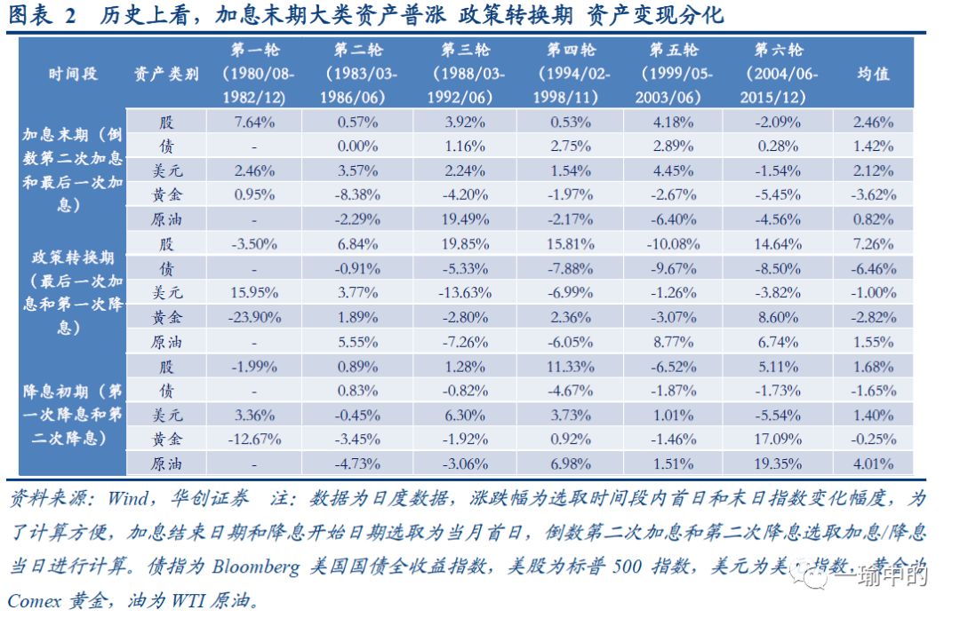 为什么普涨?是货币转鸽下的全品类资产估值修复效应。从历史上大类资产的表现来看,在加息末期,市场对美联储政策转向预期较浓,大类资产(美股美债美元油)都会经历一次普涨。但当进入政策转换期后(最后一次加息和第一次降息之间),大类资产将表现分化。