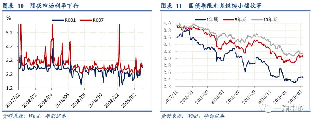 上周隔夜市场利率环比下行。上周五银行间质押式回购利率R001收于2.6713%,环比下行8.28bp,R007收于2.7811%,环比下行14.14bp(图表10)。上周1年期国债收益率环比上行0.23bp;5年期和10年期国债收益率环比分别下行2.85bp和2.96bp(图表11)。上周央行公开市场开展1100亿元逆回购操作,有200亿元逆回购到期,由于3270亿元MLF到期顺延至上周一,上周包括MLF口径在内净回笼2370亿元。
