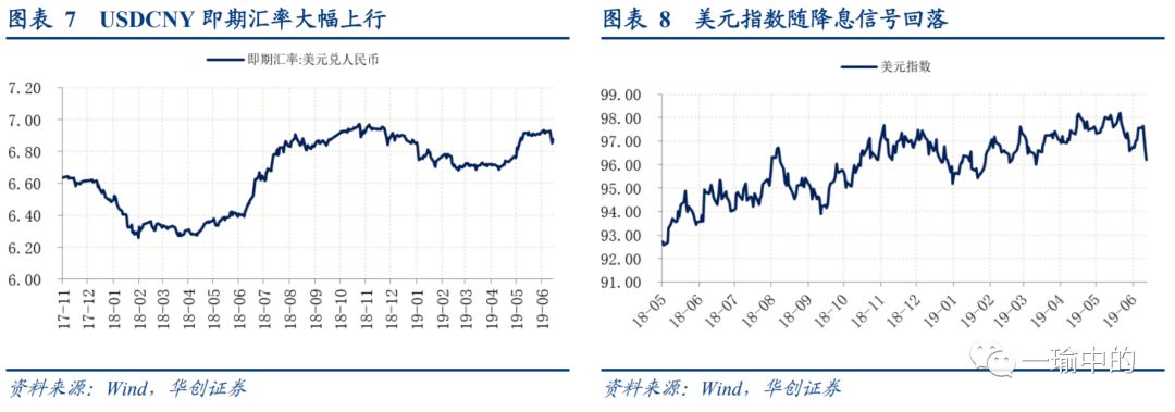 美联储将联邦基金利率目标区间维持在2.25%~2.5%,符合市场预期;点阵图隐含年内降息0次,但7位官员认为2019年底联邦基金利率应为1.875%,隐含降息2次。6月FOMC声明传递出降息的信号,对经济与通胀的表态偏鸽,强调了目前维持经济持续扩张、劳动力市场条件强劲以及2%通胀目标的不确定有所增加,对货币政策表态上删除了“耐心”这一措辞,而是改为“将采取适当措施”。6月FOMC声明发布后,7月FOMC降息概率由82%提升至100%。同时鲍威尔表示了后续缩表有临时调整的可能性。