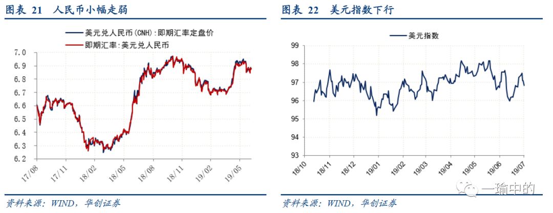 上周离岸人民币汇率小幅走强。USDCNY即期汇率收于6.8783,环比下跌2个基点;USDCNH即期汇率收于6.8750,环比上涨48个基点(图表21)。受鲍威尔国会“鸽派”讲话影响,美元指数环比大幅下降。周五美元指数收于96.8225,环比下降0.45%(图表22)。