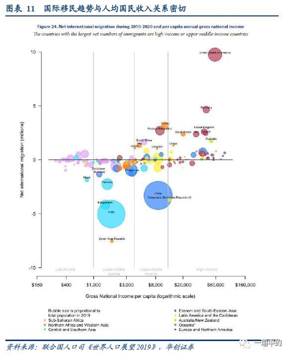 国际移民趋势与地区间人均收入差异关系密切,社会动荡是国家人口流出的内因。2010-2020年,有36个国家或地区人口流入超过20万,这其中有14个国家或地区的人口流入超过100万,这14个国家都是世行认定的高收入或中高收入国家。某些移民流入国,比如约旦、黎巴嫩和土耳其,大规模的国际移民是难民流亡推动的,主要来自叙利亚。同一时期,有十个国家经历了100万规模的人口净流出。许多国家的人口流出是临时性的劳动力转移。比如孟加拉国(2010-2020年流出420万),尼泊尔(-180万),菲律宾(-120万)。其他国家,包括利比亚(-750万),委内瑞拉(-370万)和缅甸(-130万),过去十年,人口大量流出的主因是社会动荡和冲突。