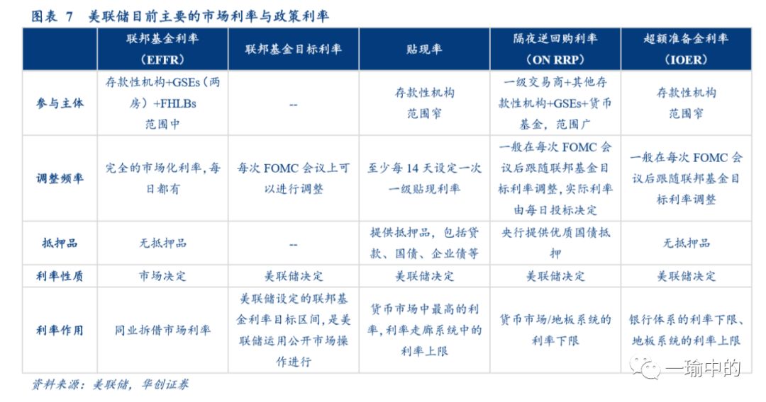 美联储价格型货币政策框架下,通过设定政策利率以引导市场利率变化。其中主要的政策利率包括存款准备将利率、贴现率、隔夜逆回购利率等,主要的市场利率则为联邦基金利率。