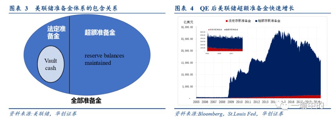 商业银行持有的超出法定部分的准备金均为超额准备金。商业银行可以通过持有库存现金(vault cash used to satisfy required reserves)的方式满足一部分的存款准备金要求(规模小,全部为法定存准金),库存现金不足的部分可以以存款形式存放在美联储(total reserve balances maintained),其中超出法定准备金的部分全部被称之为超额准备金。在QE前,美联储的超额准备金占比相对较小,约80%左右,而QE后超额准备金规模迅速上涨,占准备金的比重也提升至95%左右。