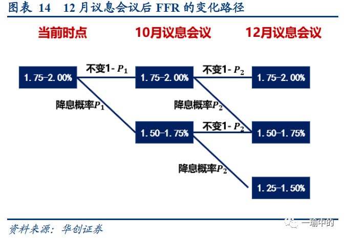 以9月19号的FF价格为基础计算12月议息会议后FFR目标区间的概率分布。9月19号当天,10月FF价格为98.1025,11月FF价格为98.2025,12月FF价格为98.2475,计算得出10月降息概率为42.8%(图12中的P1),12月降息概率为26.6%(图12中的P2),最后我们计算得出:12月议息会议后,美联储: